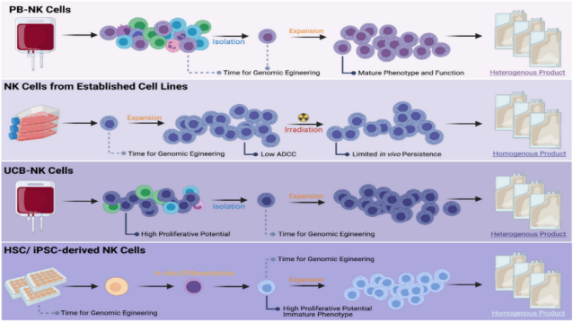 "off-the-shelf", ready to use when needed, freeze-resistant. CB-NK has a high proliferation efficiency and can instantly select HLA-mismatched products by establishing a universal NK cell bank. Has stronger bone marrow homing ability. Umbilical cord blood cells have a strong ability to proliferate. Only 10% of one cord blood unit can produce a pure cell pool of almost more than 109 NK cells within two weeks, which is usually suitable for one treatment cycle. | CB-NK cells are not fully differentiated, have relatively low expression of natural killer receptors, and have limited cell killing ability. In addition, the higher proportion of hemoglobin and red blood cells in cord blood will affect the isolation and culture of PBM, which needs to be paid attention to during the experiment. |