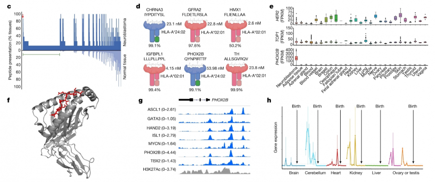 Researchers including John M. Maris of the University of Pennsylvania School of Medicine and Mark Yarmarkovich of the New York University School of Medicine first used mass spectrometry to analyze neuroblastoma (eight types of neuroblastoma) by performing MHC capture, peptide elution, and liquid chromatography and tandem mass spectrometry. (tumor cell-derived xenografts and patient-derived xenografts), and then compared the immune peptide group presented by MHC I and the immune peptide group potentially presented by normal tissue cells to screen for peptides specifically presented by the tumor, and finally determined the differences. Antigenic peptide PHOX2B. PHOX2B is only expressed in tumor tissues and is no longer expressed in normal tissues with development, so it is used as an immunotherapy target (Figure 2).