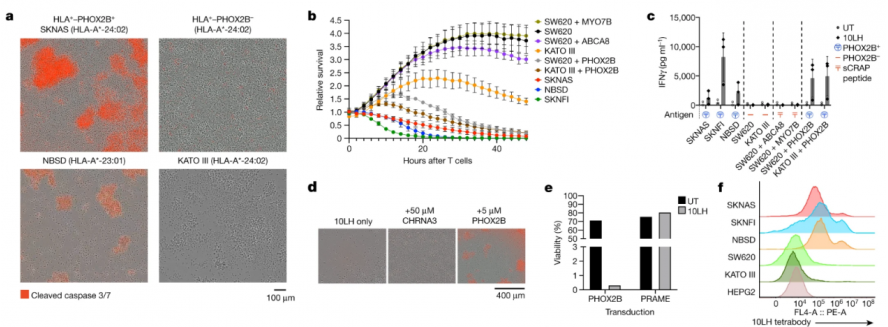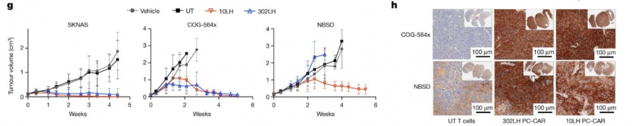 The researchers demonstrated the powerful tumor-specific killing ability of PC-CAR T in in vivo and in vitro experiments. The researchers first tested the potent and specific killing effect of PC-CAR T in neuroblastoma cell lines (SKNAS, NBSD and SKNFI) (Figure 4), and in three cell lines that do not express PHOX2B (SW620, colorectal The functional cross-reactivity of PC-CAR T with the peptide environment presented by off-target tissues was tested in adenocarcinoma cell line; KATO III, gastric adenocarcinoma cell line; and HEPG2, hepatocellular carcinoma cell line) (Figure 3) and the results showed that PC- CAR T cells can selectively eliminate tumors without targeting and killing PHOX2B-negative cell lines.