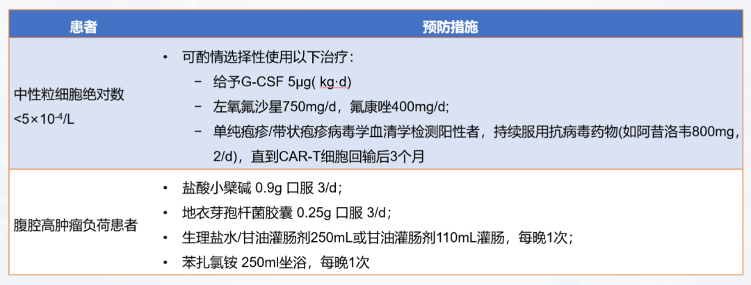 为了清除患者体内正常的淋巴细胞,消除免疫抑制因素,创造一个有利于CAR-T细胞扩增的免疫微环境,在CAR-T回输前还需要进行淋巴细胞清除化疗。淋巴细胞清除化疗常用方案为氟达拉滨+环磷酰胺 (FC方案)。化疗结束后,患者的免疫水平大幅度下降,这个过程中需要防止病人感染,常见的感染防控措施如图六所示。