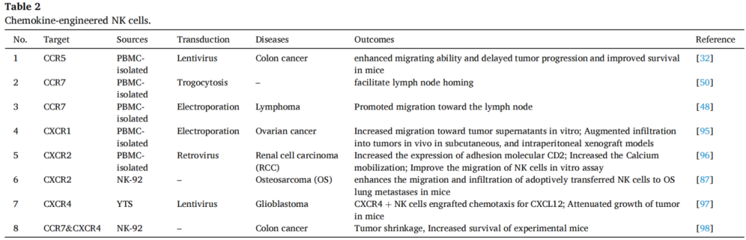 除了添加细胞因子外,还可以利用基因工程技术过表达NK细胞表面趋化因子受体,以此提高NK细胞对肿瘤细胞的浸润能力。表2为文献总结的几种过表达趋化因子受体的工程化NK细胞。